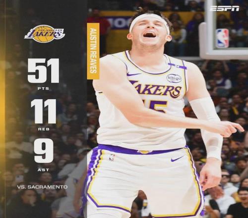 单核带队的里夫斯,投篮22中12,其中三分10中6,罚球22中21狂轰51分11板9助炸裂数据,正负值+22,湖人127-120击败国王。